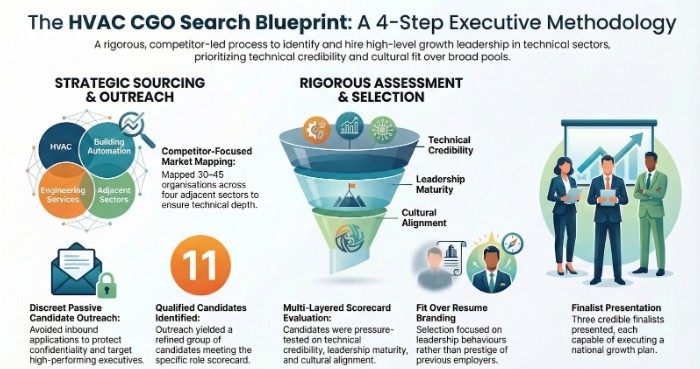 Many CGO searches land in a 6 to 10 week window from kickoff to accepted offer when the criteria are clear, and scheduling is responsive. HVACExec reduces time-to-shortlist by starting with mapped passive candidates rather than building a pipeline from scratch.