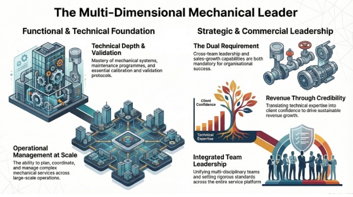 It means integrating performance across multiple disciplines with different standards and metrics. The SVP must align mechanical maintenance, compliance-driven programs, and technical sales support under one operating approach, while still driving growth. This requires both technical authority and leadership credibility across diverse teams.